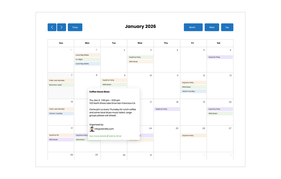 Yes. Users can easily swap between month, week, and day views with a single click directly on the calendar. They’ll also see any customized features you’ve configured in the backend, including the option to add events to their own Google Calendar with a single tap.